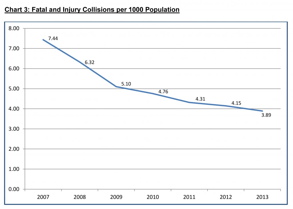 From a public safety perspective, the headline is on page 13 and it’s great news for Edmontonians: The number of collisions that cause injuries and fatalities is going down, way down. Back in 2007, there were 7.44 such collisions per 1000 Edmontonians. Last year that number was 3.89 per 1000 people.