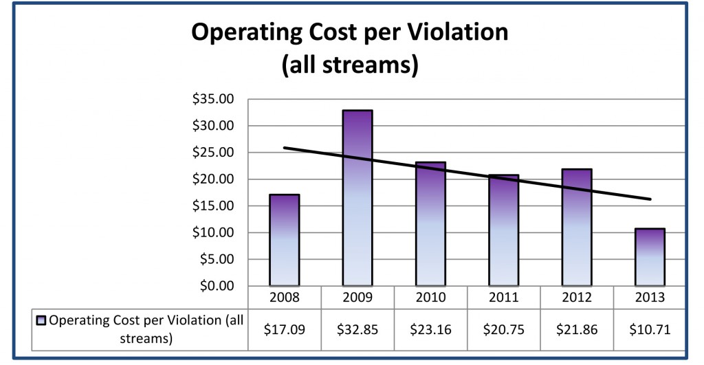 The goal of the Auditor’s review was to assess the City’s strategy of taking over the enforcement role from the private company that used to administer the program. One of those measures is cost savings. The review shows that while the cost for the city-run program is higher than predicted back in 2007, it is not costing taxpayers extra money because the fines collected cover it. In fact, the review shows we are getting more efficient every year. The cost per ticket has gone from $17.09 in 2008 to $10.71 in 2013.