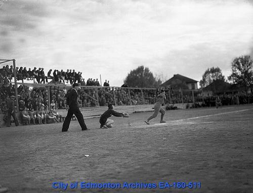 Want to learn more about local baseball history? The City of Edmonton Archives has considerable material available for the public. There are newspaper clipping files on teams (20 folders on the Trappers alone) and individuals (e.g. John Ducey, “Mister Baseball” and Deacon White, the “King of Sports” in Edmonton during the 1920s), and more than 400 digitized photographs covering the local baseball scene.