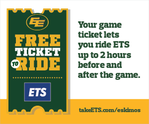 It’s also your ticket to ride on ETS’ Football Park & Ride service. The Free Ticket to Ride program, a collaboration between the City and the Edmonton Eskimos, aims to reduce football parking pressure in the surrounding neighbourhoods, reduce traffic congestion and improve pedestrian safety around Commonwealth Stadium.