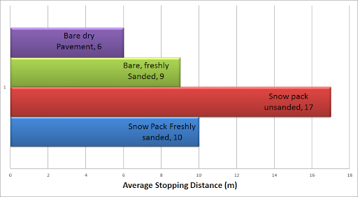 The purpose of Edmonton’s snow and ice pilot project is to support Vision Zero’s goal of safe travel—whether on a road, bike lane or sidewalk. It’s about serving vehicle drivers, cyclists and pedestrians by matching the safest snow-and-ice-removal tool to condition (e.g., temperature, humidity, type and amount of precipitation) to reach bare pavement during the winter season. The facts show how much less distance it takes for an automobile driver moving at 30 km/h to stop on bare pavement.