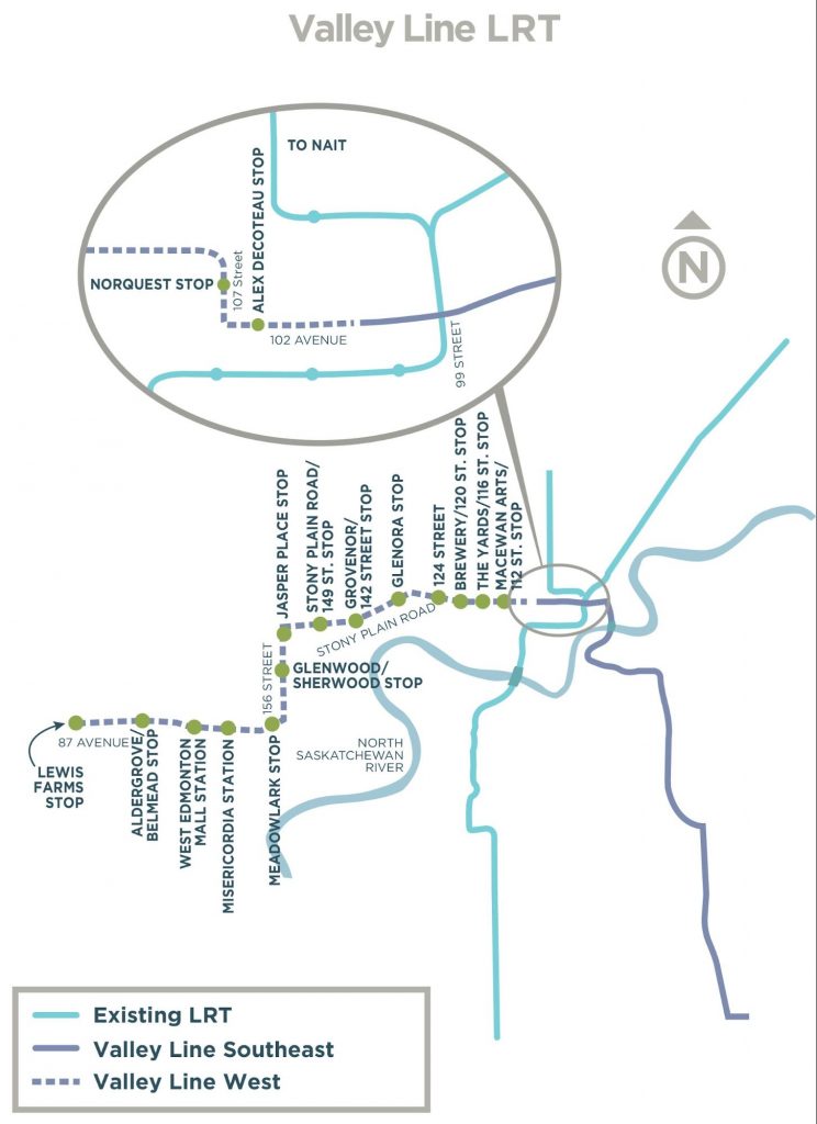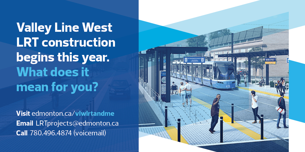 Editor’s note: The image at the top of the post shows an artist’s rendering of a downtown-bound LRT train at the Jasper Place Stop on 156 Street across from the Orange Hub. Check out the Valley Line West LRT & Me webpage to learn more about construction impacts.