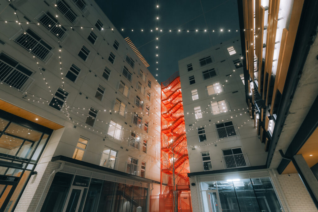 One of the most unique features of the building is the public courtyard, which connects 102 Avenue to 123 Street. The space was designed to be warm and inviting with intentional lighting, seasonal events and pop-up shops to keep the space active, making it a destination rather than just a walkway.