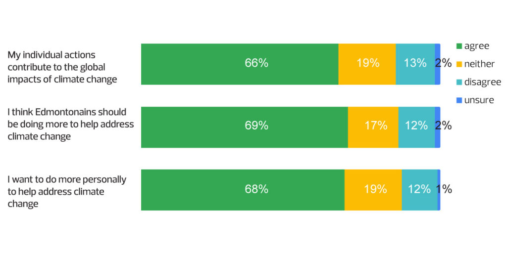 Those surveyed agreed that their individual actions contribute to the global impacts of climate change (66 per cent), that Edmontonians should be doing more (69 per cent) and that they want to do more personally to help prevent climate change (68 per cent).