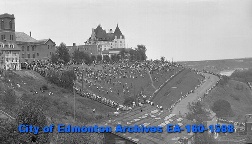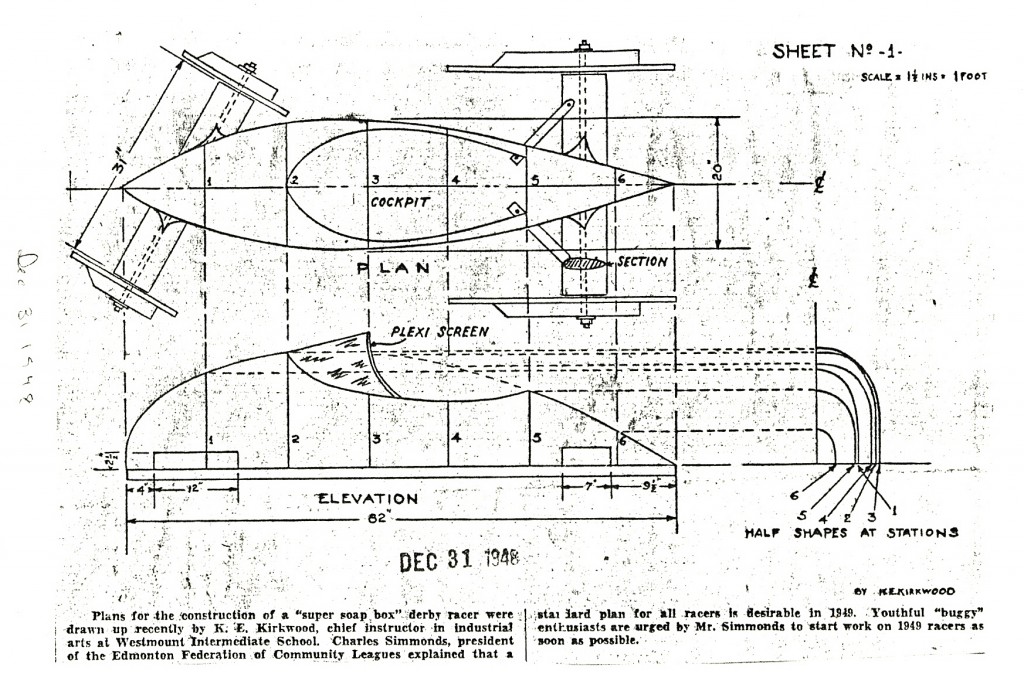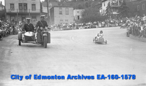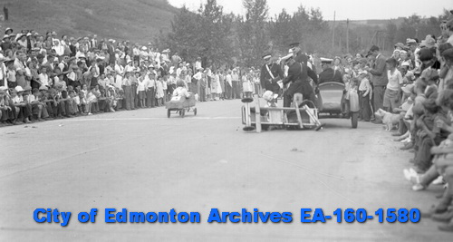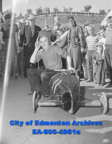 The earliest reference I found in the City of Edmonton Archives was a 1936 newspaper clipping announcing the first annual Soap Box Derby down Scona Hill, sponsored by the Edmonton Journal. It was the brainchild of Boston Bruin Roger Jenkins who donated a handsome trophy. I’m not sure why Jenkins was involved but according to the Hockey Hall of Fame he did play for the Edmonton Imperials for the 1929-30 season before starting in the NHL so perhaps he still called Edmonton home in the offseason in 1936.