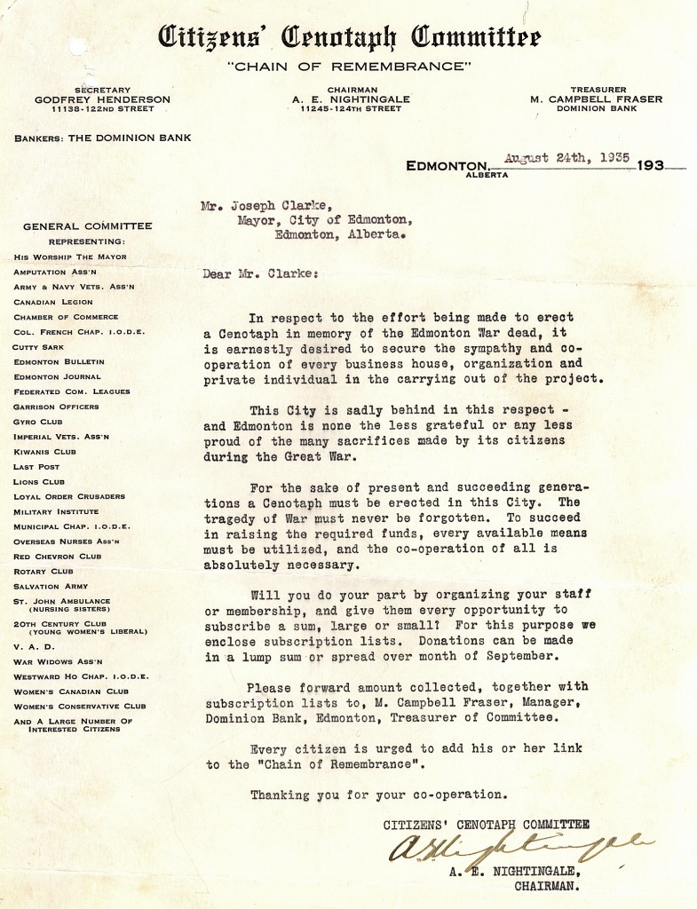 Edmonton took longer to build a memorial and the delay was painful to some as expressed in the 1934 letter below from the Chair of the Citizens’ Cenotaph Committee to the Mayor. You can feel the urgency in the letter’s tone.