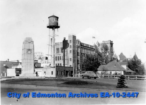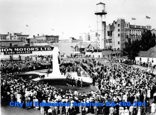 Edmonton’s cenotaph was originally located at the top of Bellamy Hill but due to increasing traffic and the lack of space to hold ceremonies it was moved to its present location in front of City Hall in 1978. This move was not without controversy, not only whether it should be moved or not, but where it should go. I looked at letters and newspaper articles on the subject from the late 1950s to February 1978 when Council approved the move.