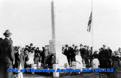 The first war memorial in Alberta was in Beverly. According to historian Lawrence Herzog, the Town of Beverly (population of about 1,000) had 170 men serve in the war, of which 27 died in action. When the war was over, local veterans founded the Beverly Veteran’s Association and started fundraising for a memorial. The Beverly Cenotaph was completed in October, 1920. Located at the corner of 118 Avenue and 40 Street, the newly restored Beverly Memorial Cenotaph Park will be the site of a Remembrance Day ceremony.