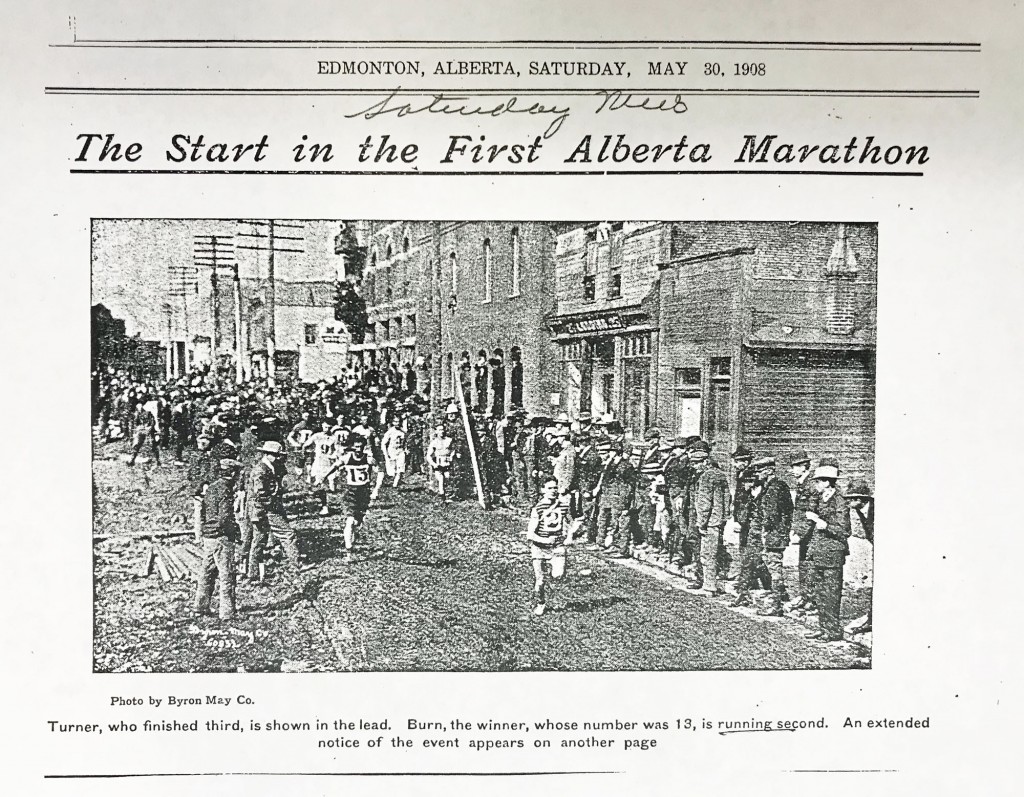 The first marathon in Alberta was profiled in the May 30, 1908 edition of the Saturday News, published in Edmonton. The race began at the Alberta Hotel and ended at the race course in Fort Saskatchewan. The winner, Art Burn of Calgary, was given the honour of competing in the Olympic Games held in London, England in that year. (Avid runners will be interested to know that it was in these games that the marathon was lengthened from 25 miles to just over 26 miles, in order to begin beneath the windows of the Royal Nursery at Windsor Castle, and to end at the Royal Box.)