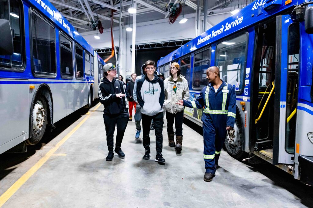 Students boarded an Edmonton Transit Service (ETS) bus and took a ride through the bus wash before touring the rest of the facility, which is the size of about four Canadian Football League fields. Derek Hanson, Director of TFM within the City’s Fleet and Facility Services (FFS) branch, led the students through a tour that included a look at a bus maintenance bay and electric bus charging stations, plus stories from staff.