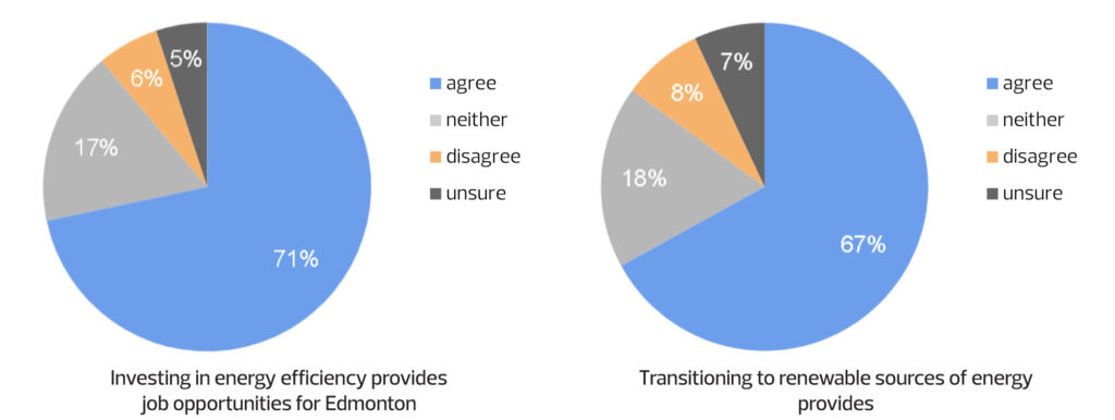 A large majority of Edmontonians recognize economic and employment opportunities associated with addressing climate change. Specifically, 71 per cent agree that investing in energy efficiency provides job opportunities for Edmonton, 67 per cent agree that transitioning to renewable sources of energy provides job opportunities for the city, and 64 per cent agree that efforts to prevent climate change present economic opportunity for Edmonton.