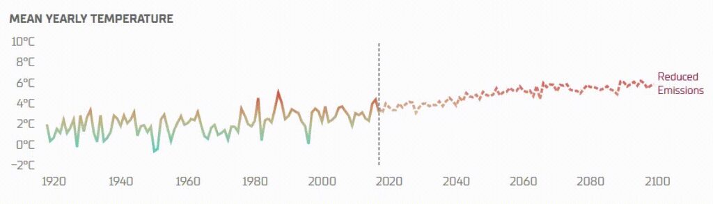 Since 1917, Edmonton’s mean annual temperature has risen by 1.7 C, with winters showing the most warming, by 3.2 C. If, globally, we continue to emit greenhouse gases (GHGs) at a rate similar to today, the world could see an overall warming of 4 C by 2100.