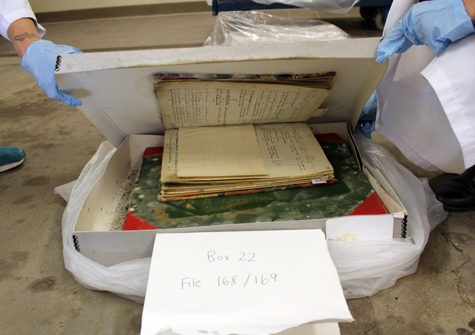 At some point, an exposed pipe started leaking water in one of our vaults. It dripped directly down a shelving unit and onto 100 year old records which absorbed it like sponges. There was no telltale watermark on the ceiling, or puddle on the floor. We monitor temperature and humidity daily, but there wasn’t a telltale spike to show anything was out of the ordinary. We have rolling shelves to maximize floor space and this particular stack was closed so there was no visual clue that anything was happening. Mould can start growing after 2 days so we can’t tell exactly when it started. By the time it was discovered several metres of records were soaked, others were damp and there was significant mould growth. All in all about 40 boxes were involved.