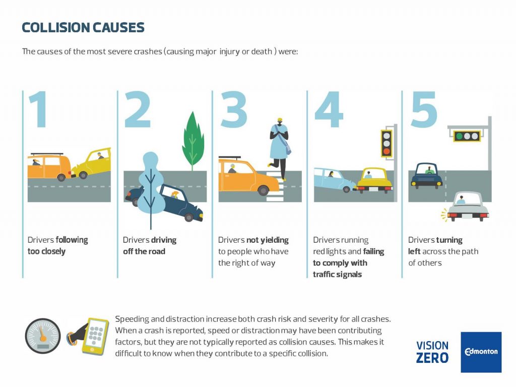 The list below outlines the top five causes of the most severe crashes and patterns identified through an analysis of all vehicle-related collisions in Edmonton.