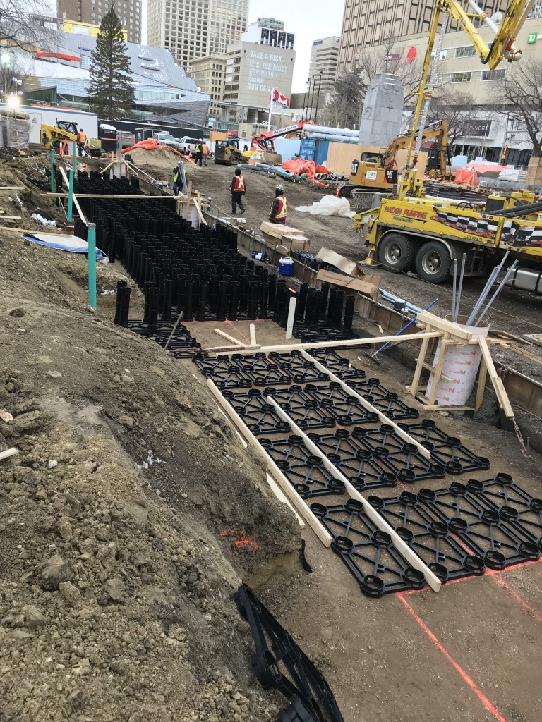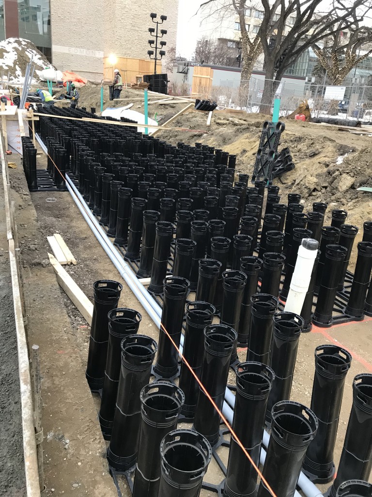 Soil cells were installed along the east and west side of the fountain to support healthy tree growth.