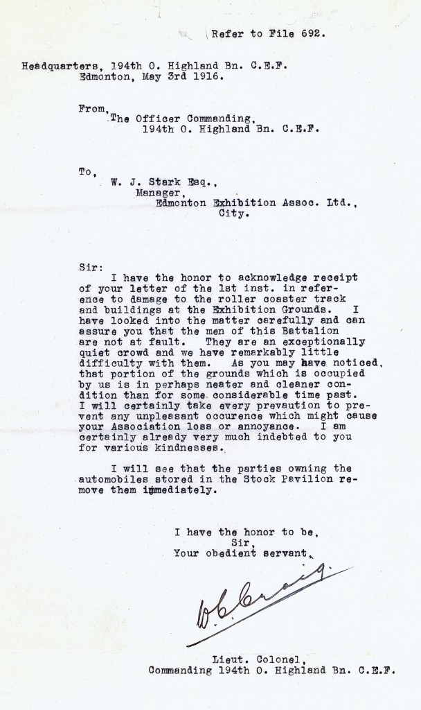 A series of letters (MS-322.6) between various commanding officers and W.J. Stark of the Exhibition Association, all dating from 1916, reveal interesting tidbits of day-to-day life for the troops. For example, the 194 Battalion was granted permission to hold sports competitions and bet on horse races as a Victoria Day celebration. The 233 Battalion was allowed to use a corner of the pavilion as a pool room, provided it first moved the “poultry equipment” housed there to a new location! The letters also divulge mishaps like a late payment for horse feed, the theft and damage of two fire extinguishers, and the vandalism of a roller coaster. In spite of this, it seems that the soldiers greatly appreciated the Exhibition’s hospitality, with several battalions sending letters of thanks.